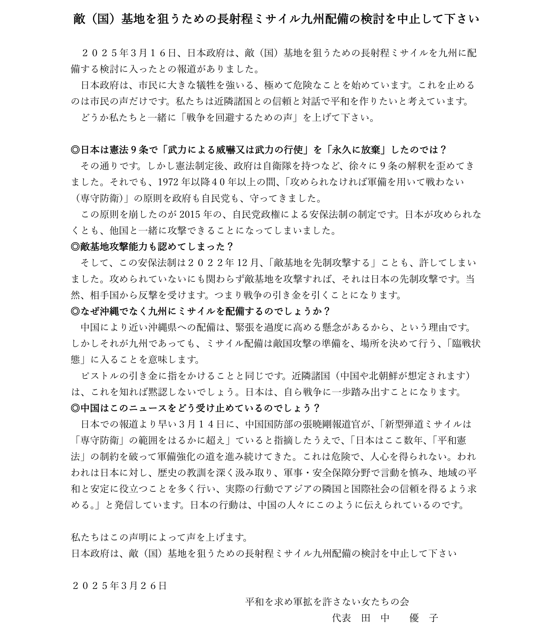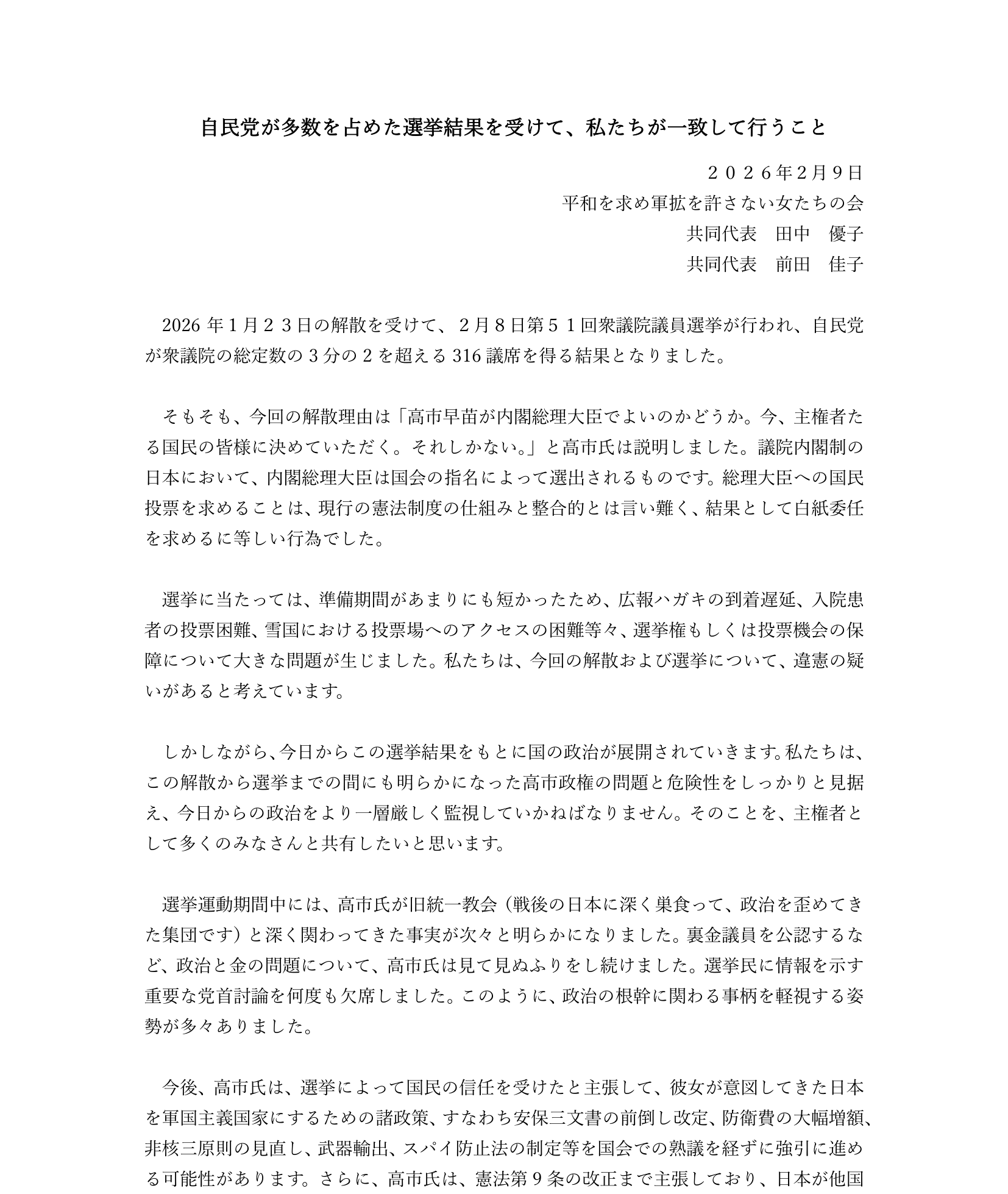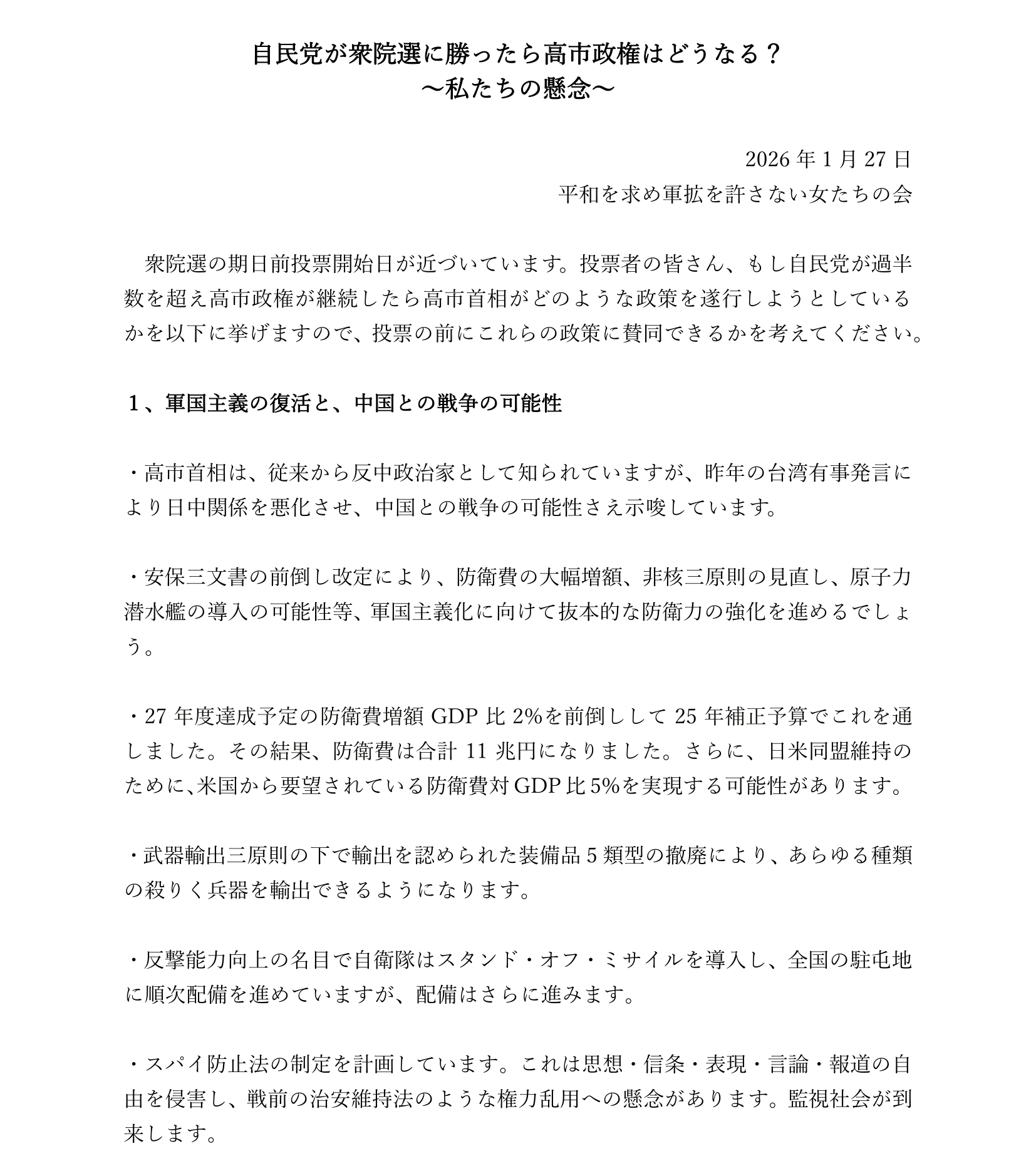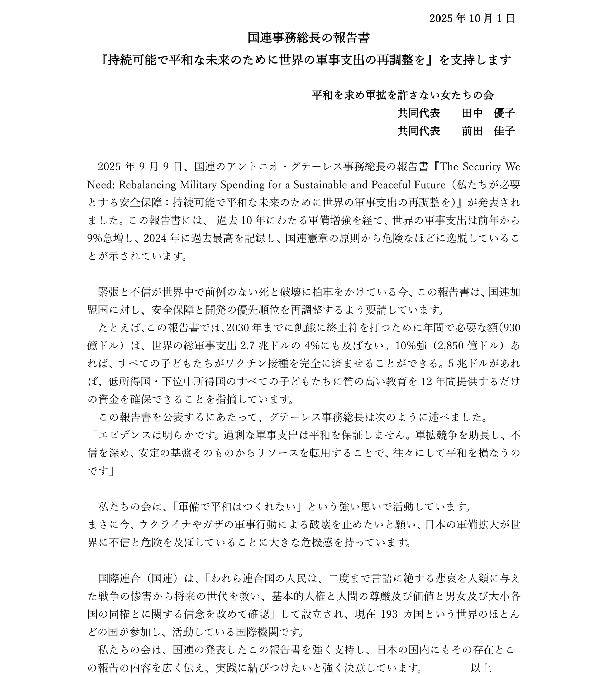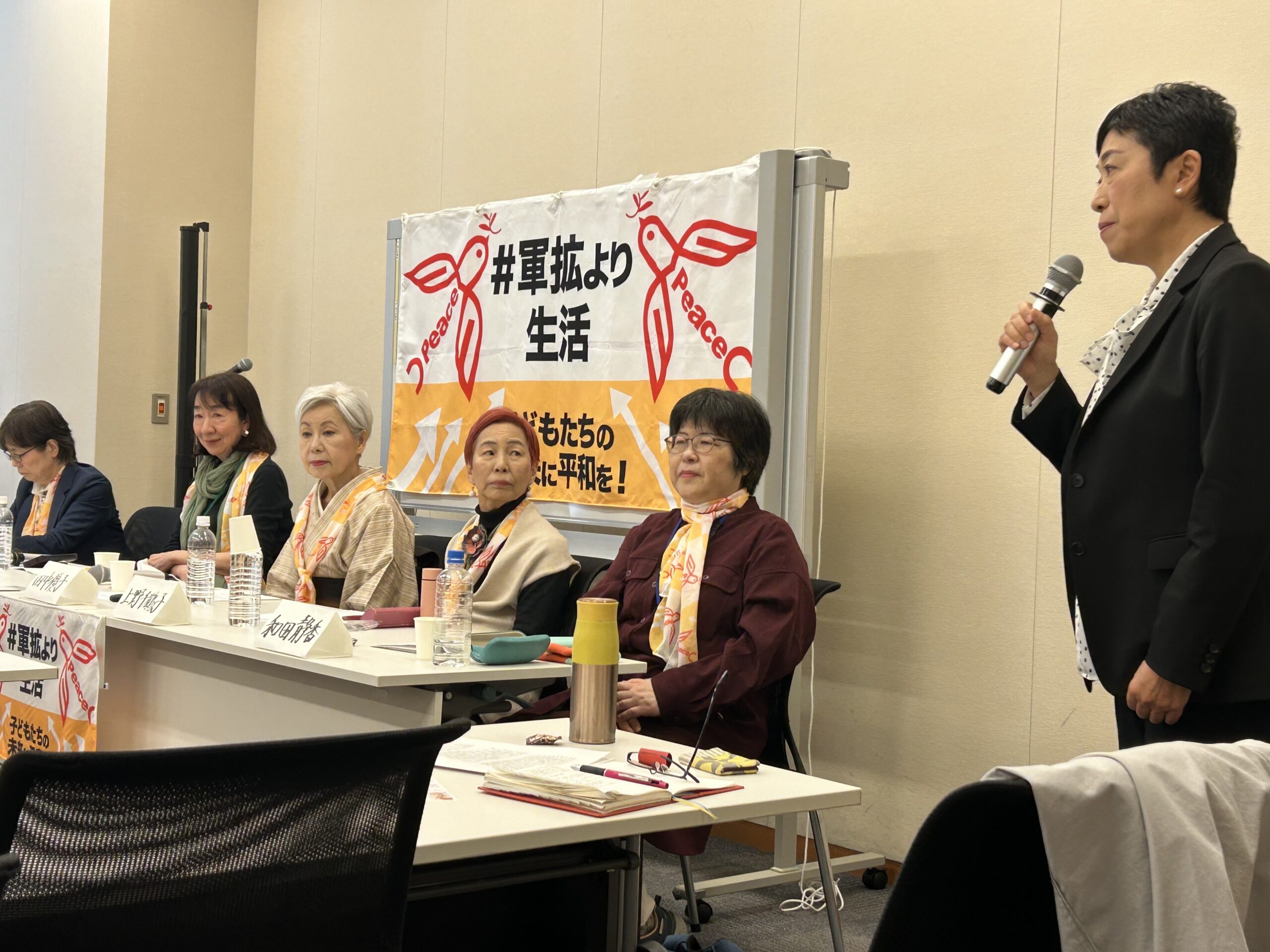 女性は今なら、声を上げられます。私たちの会は、軍拡によって少子化対策や労働者の賃上げ、女性や1人親家庭、非正規労働者、子どもなど、社会的弱者のための公的支援の政策が、マイナスの影響を受けること、日本の教育への公的支出が先進国で最低レベルである状況に、重大な危機感を持っています。