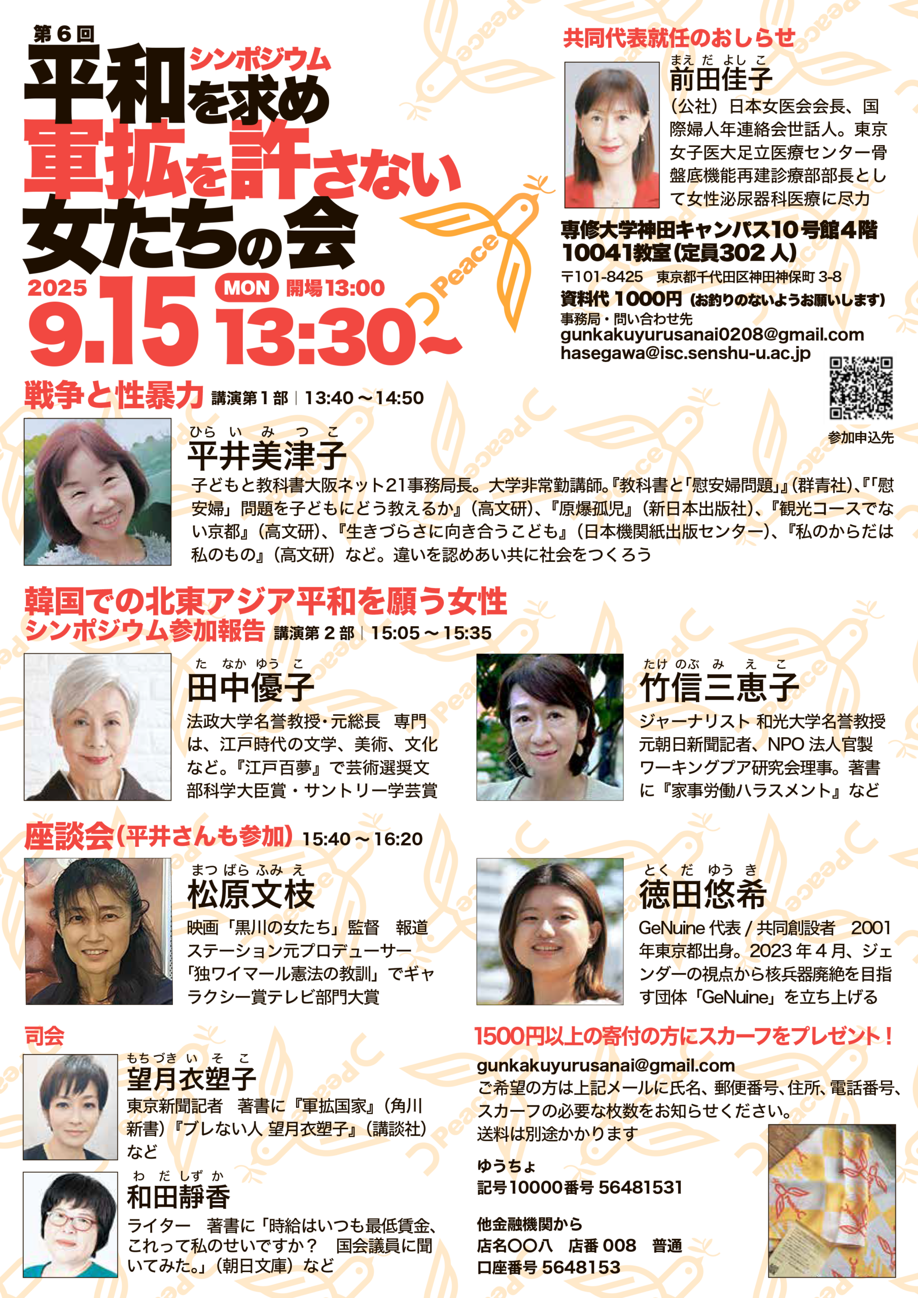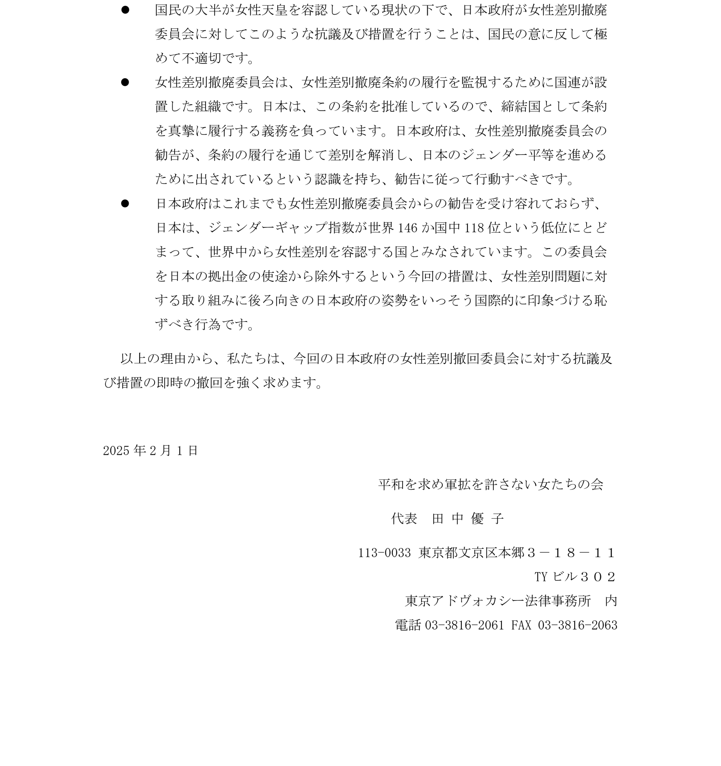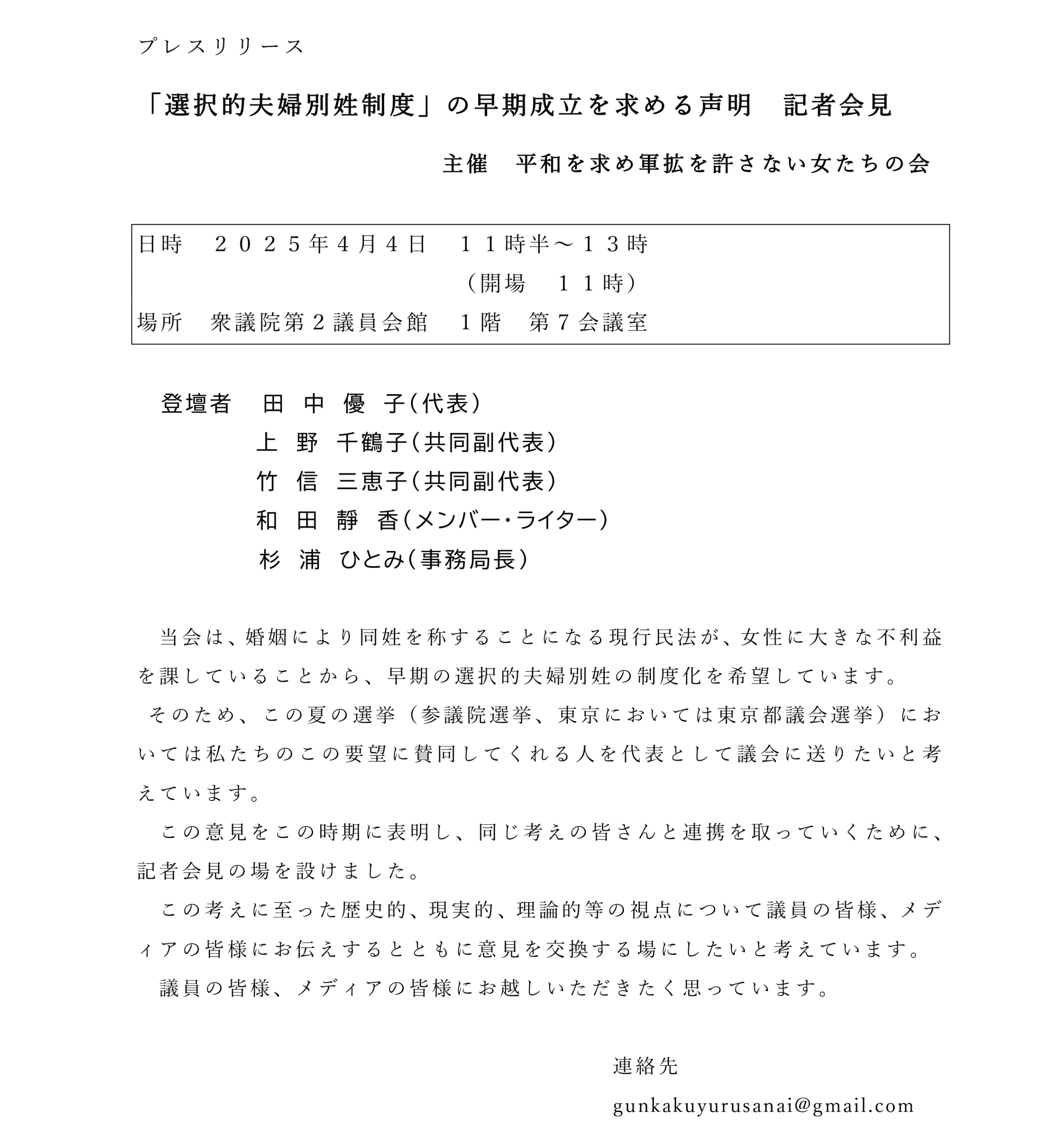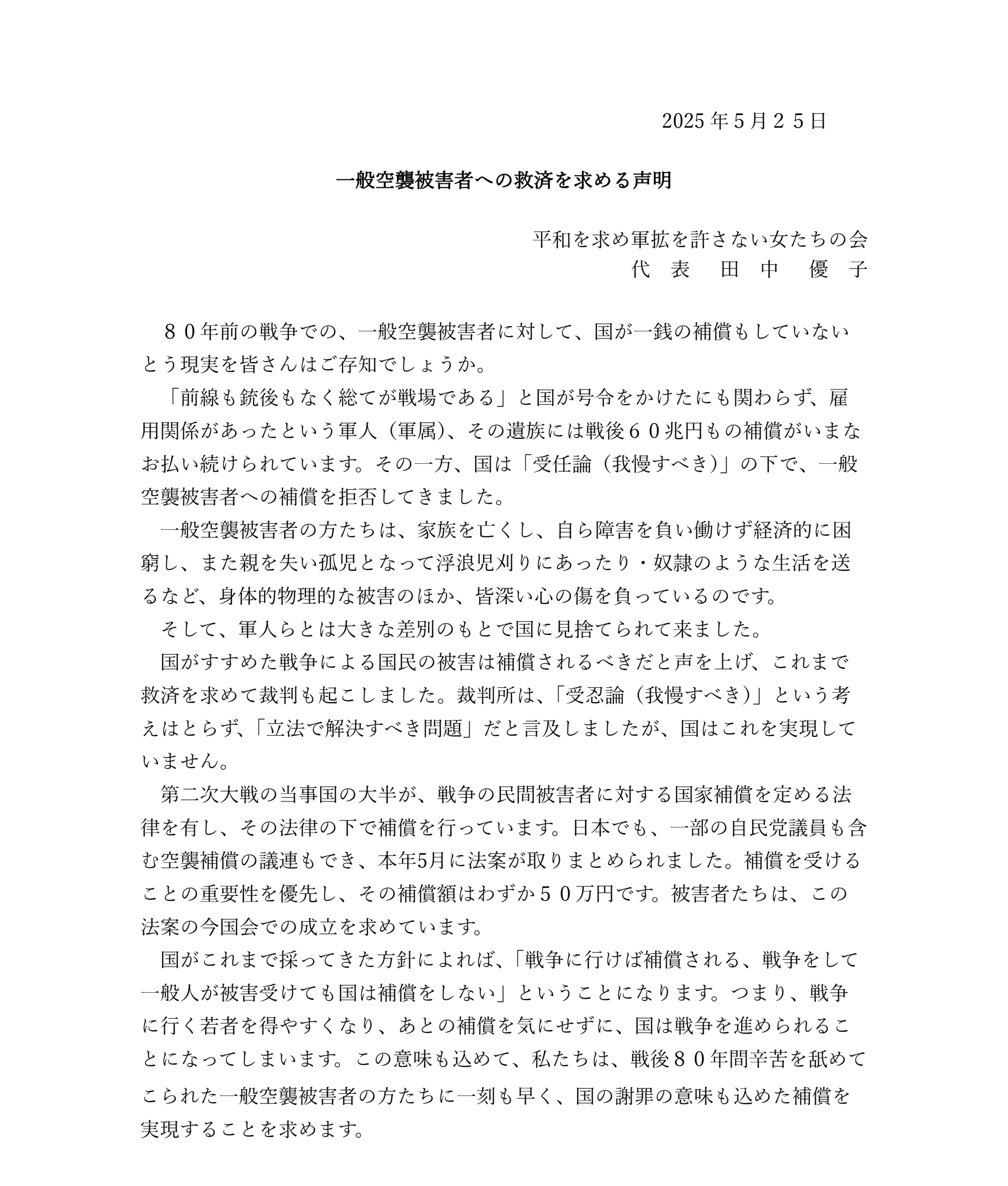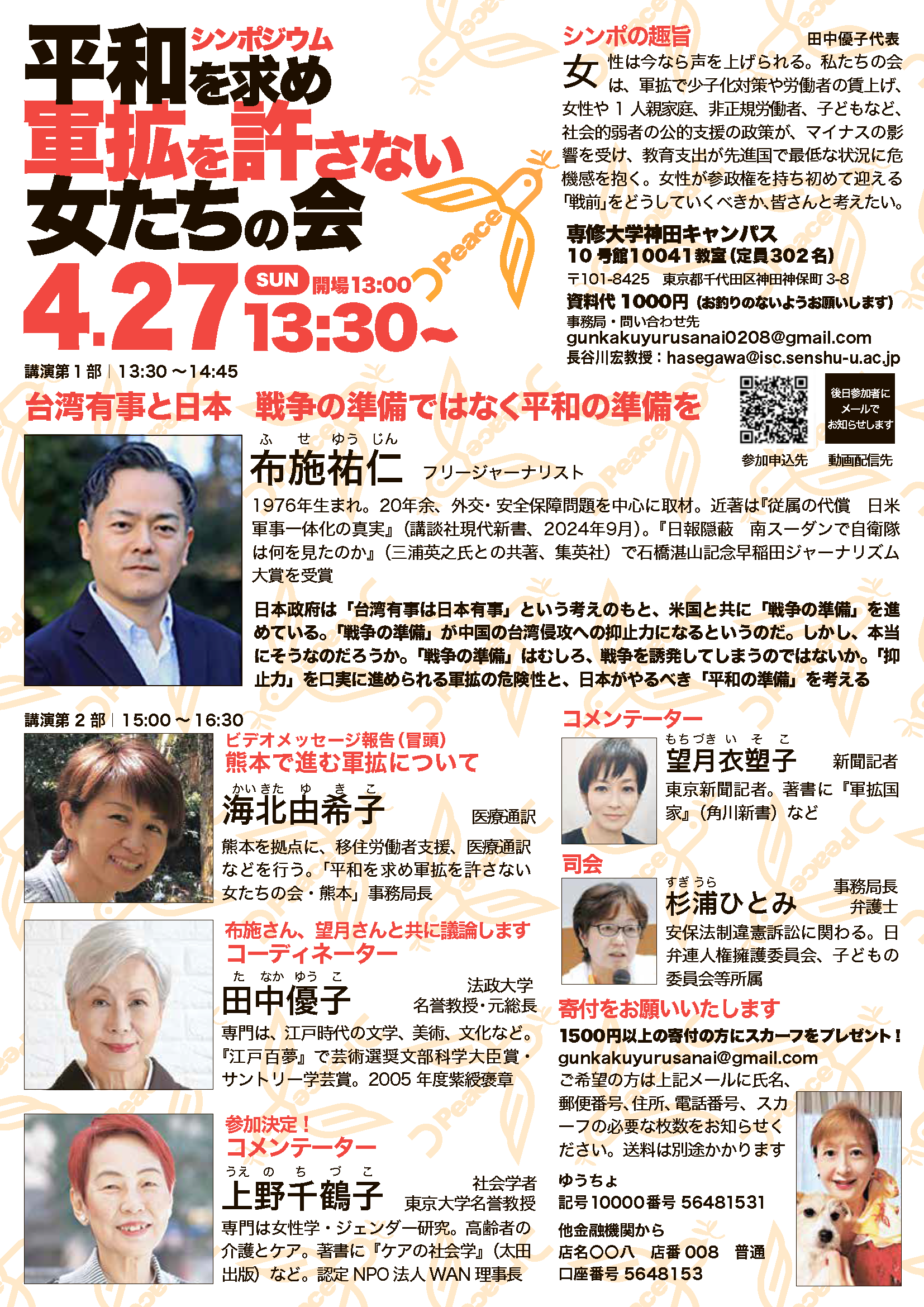 女性は今なら、声を上げられます。私たちの会は、軍拡によって少子化対策や労働者の賃上げ、女性や1人親家庭、非正規労働者、子どもなど、社会的弱者のための公的支援の政策が、マイナスの影響を受けること、日本の教育への公的支出が先進国で最低レベルである状況に、重大な危機感を持っています。