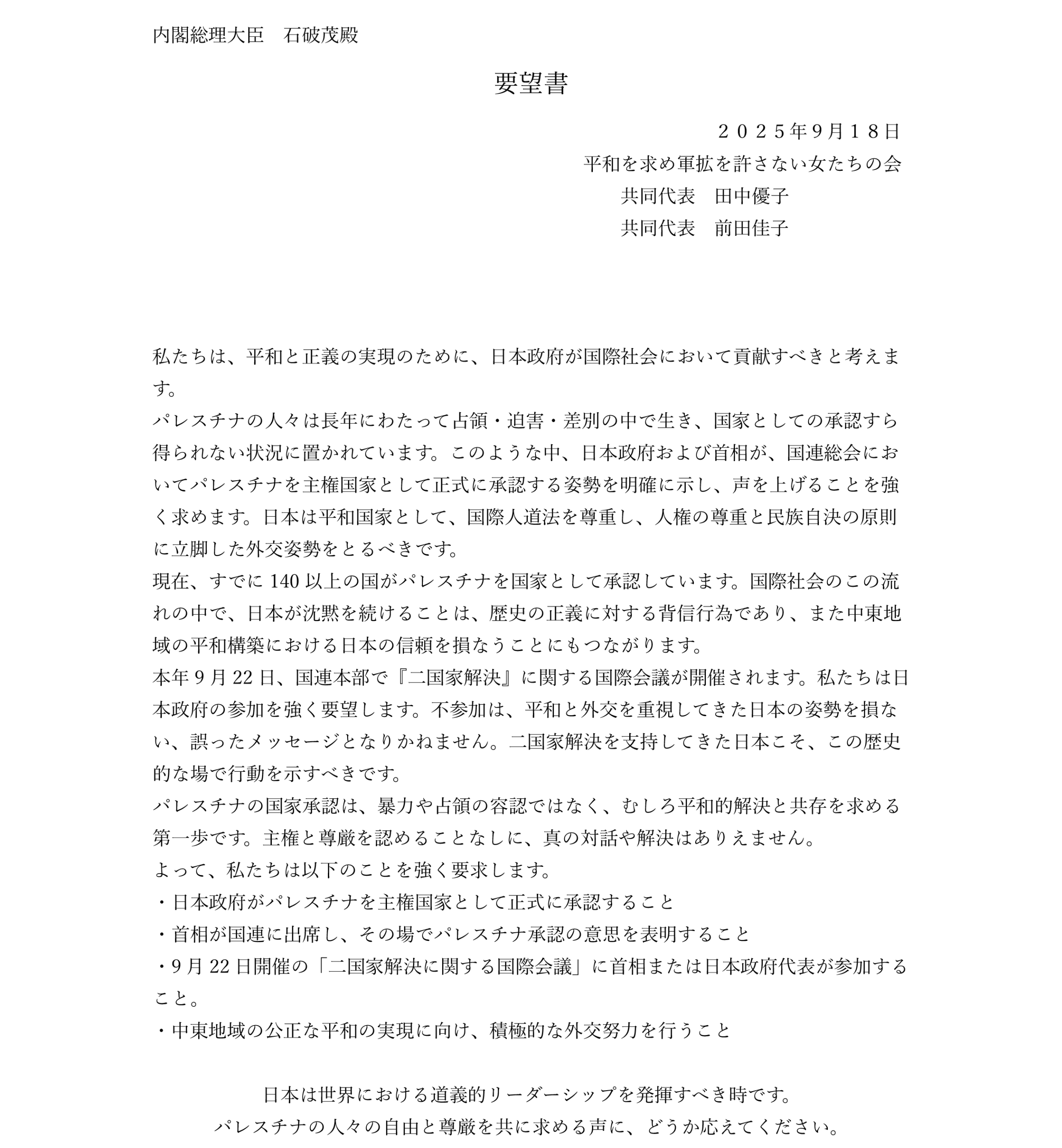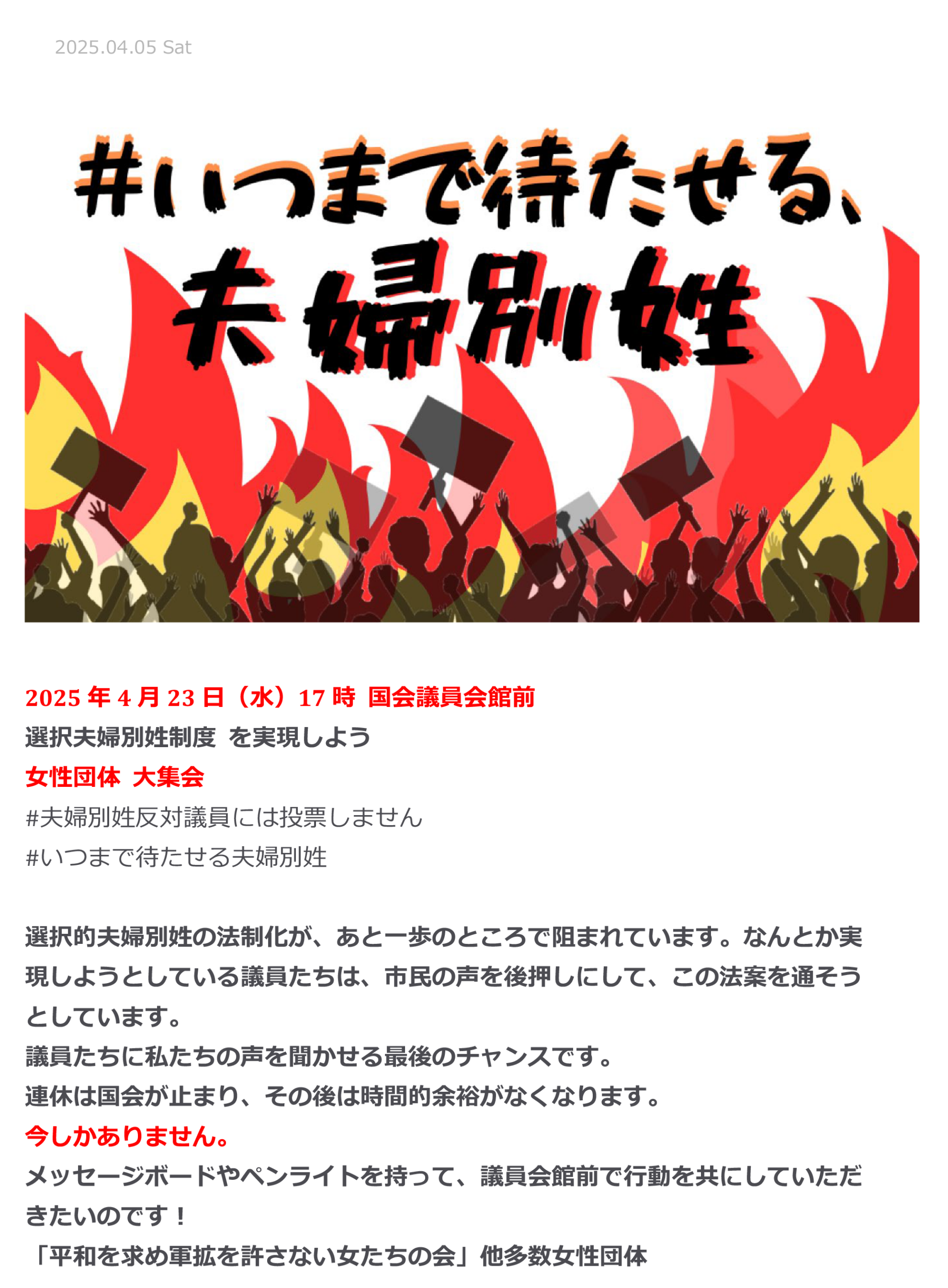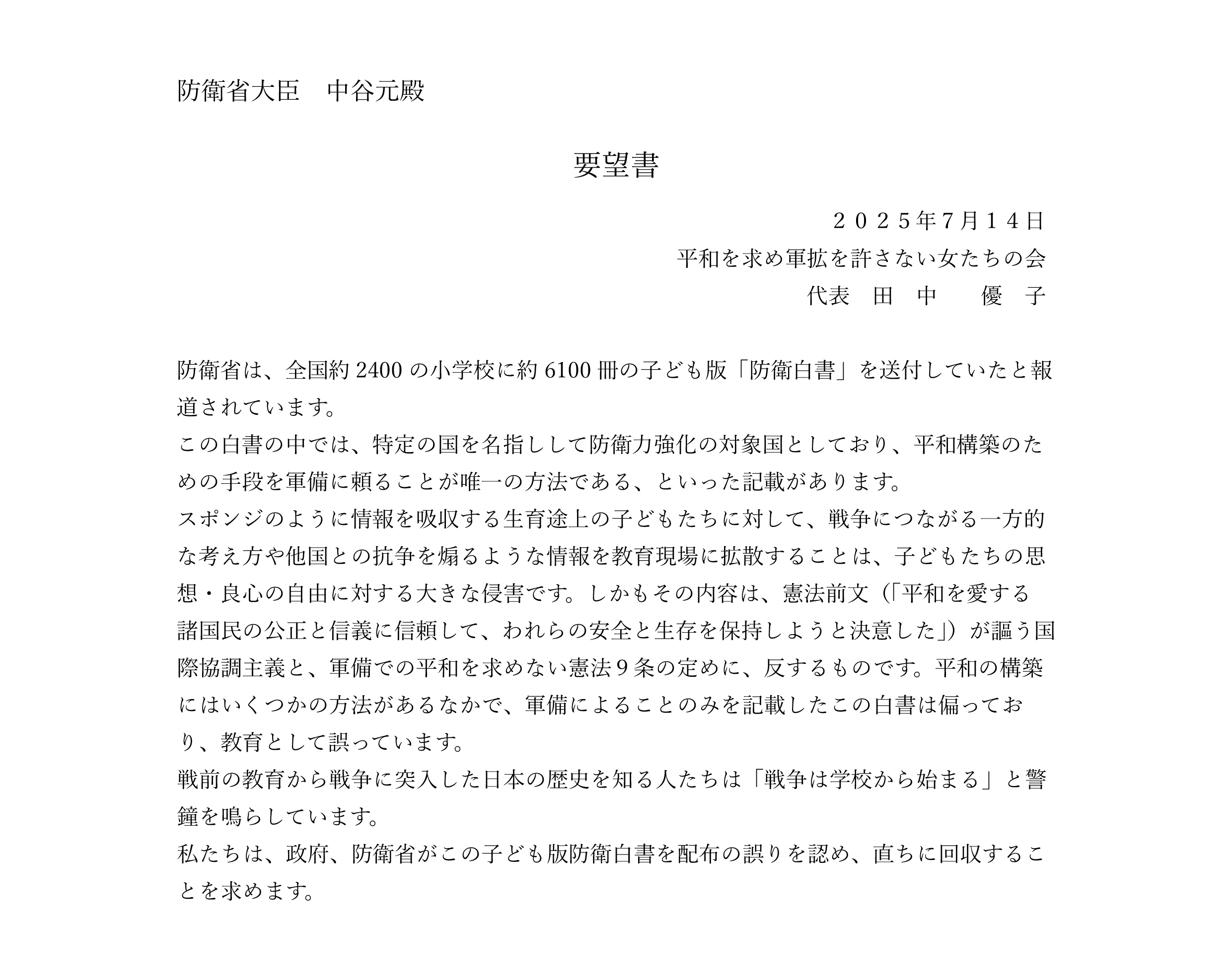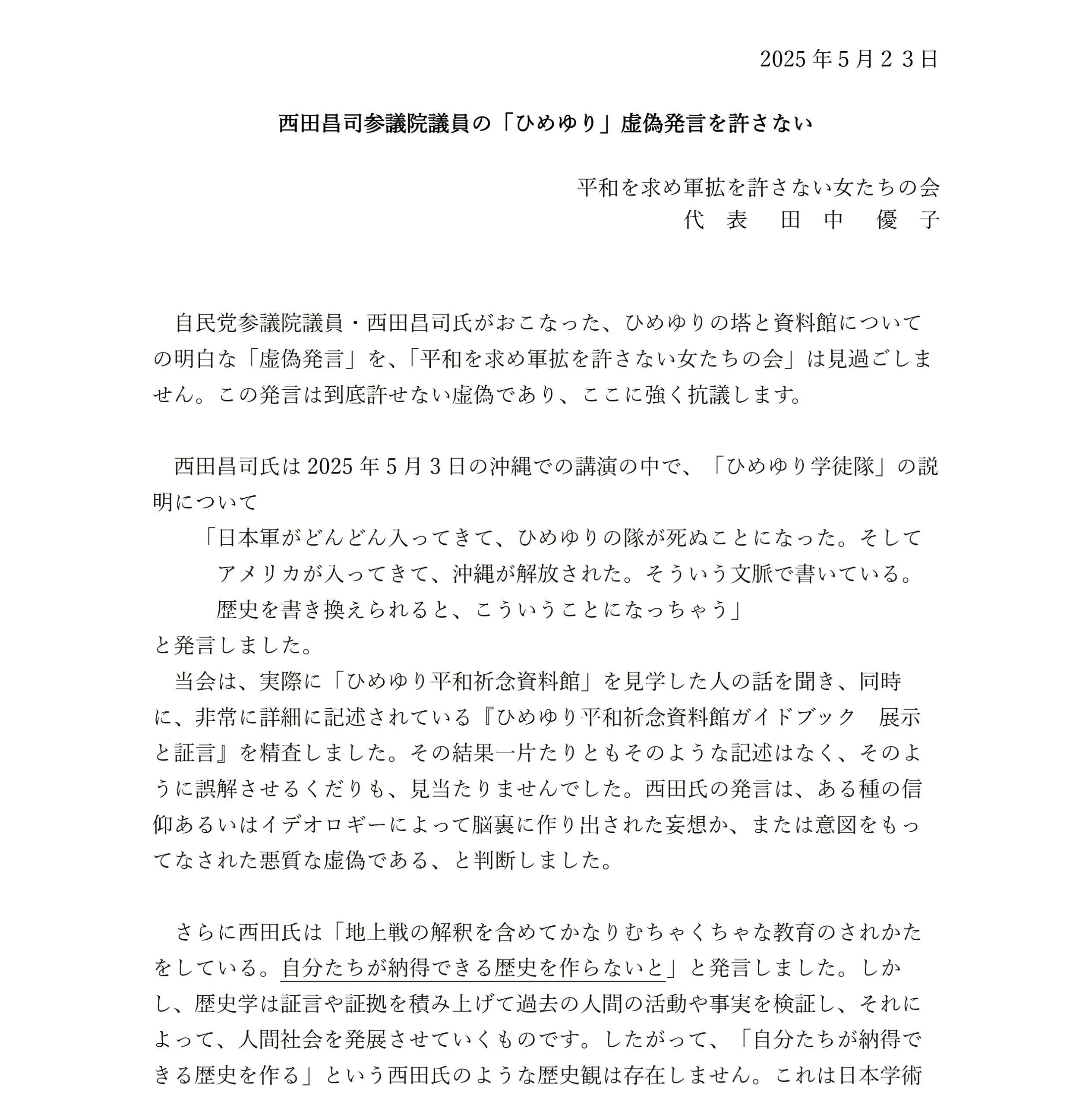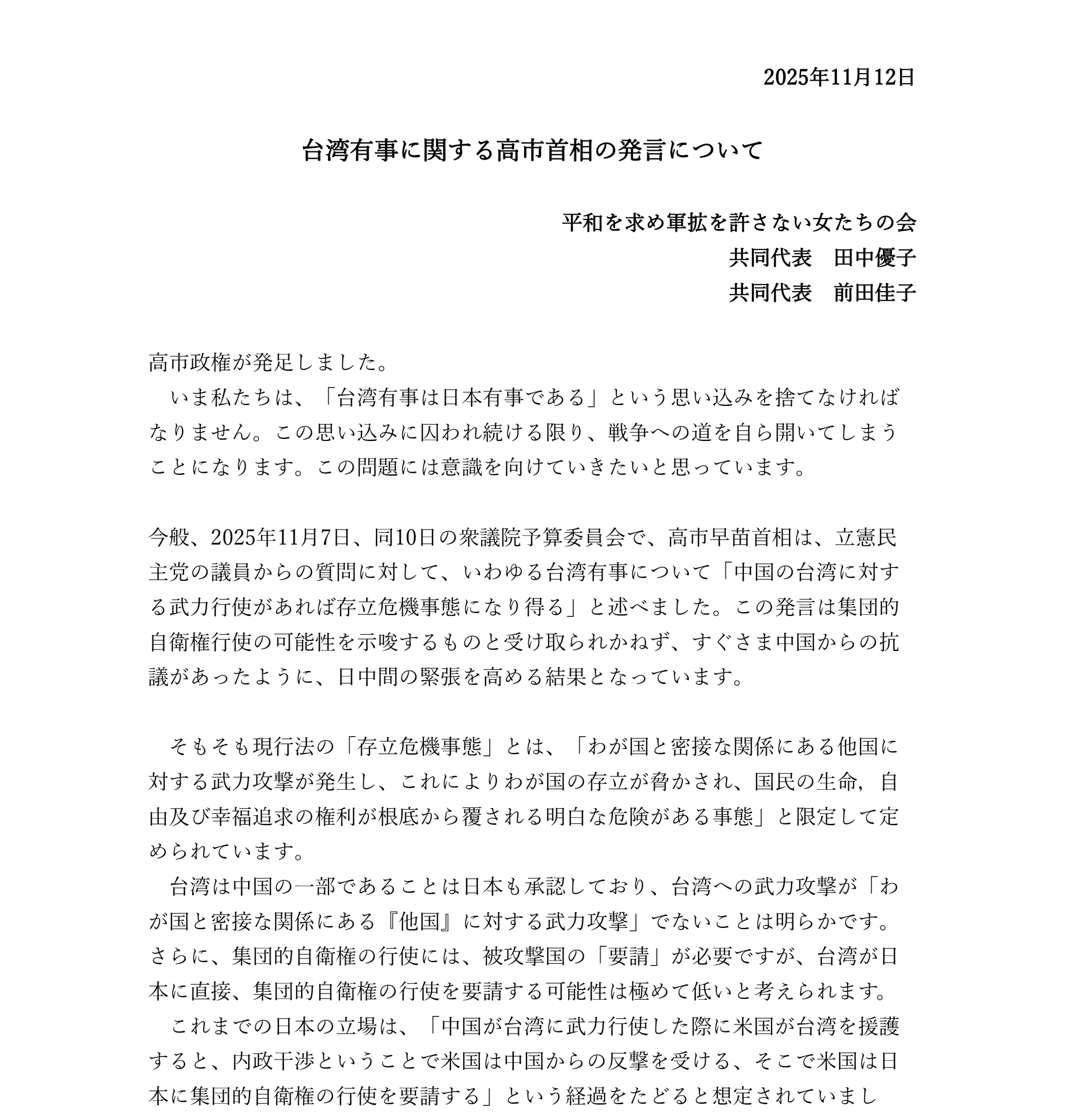 女性は今なら、声を上げられます。私たちの会は、軍拡によって少子化対策や労働者の賃上げ、女性や1人親家庭、非正規労働者、子どもなど、社会的弱者のための公的支援の政策が、マイナスの影響を受けること、日本の教育への公的支出が先進国で最低レベルである状況に、重大な危機感を持っています。