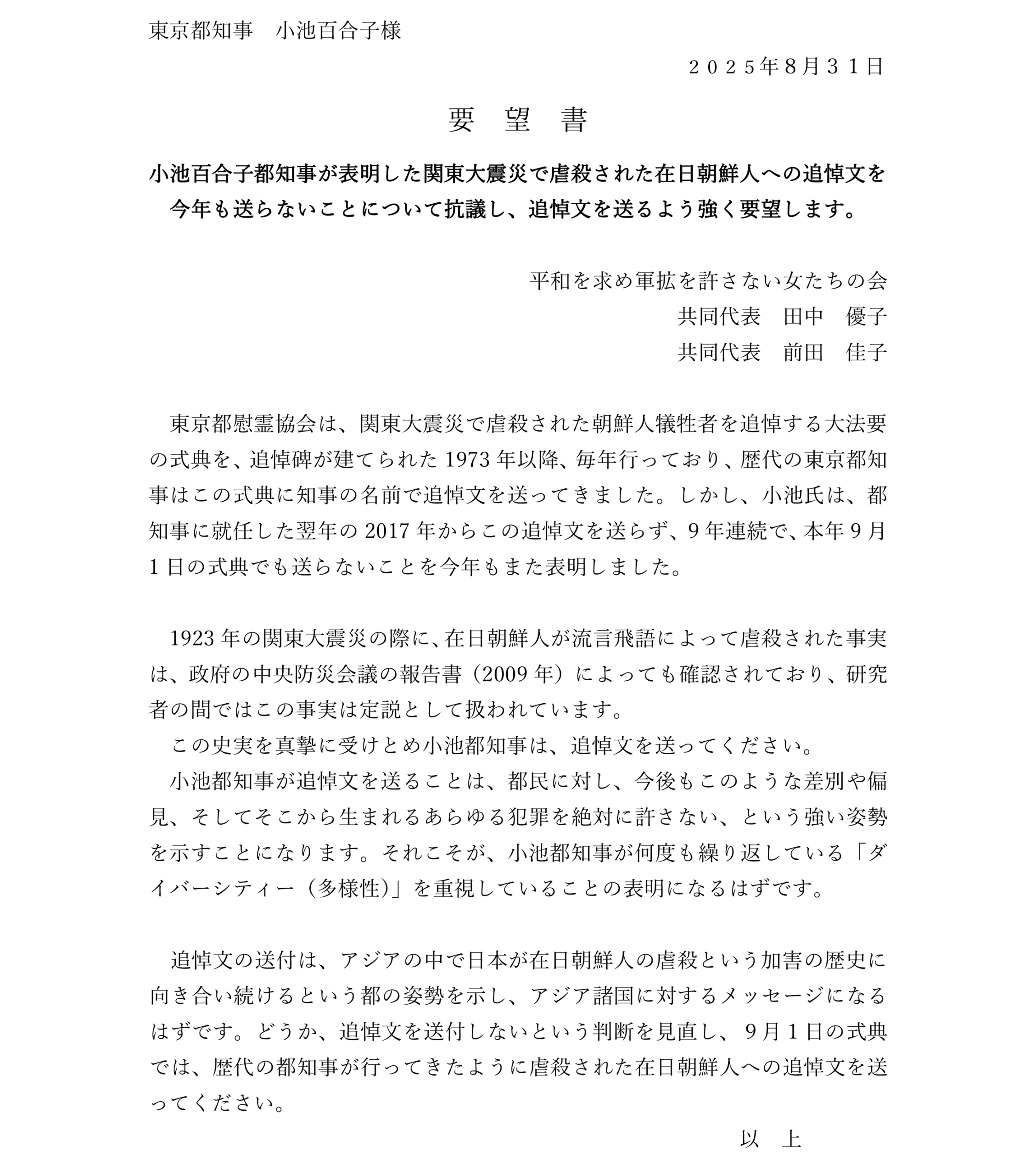 関東大震災時における在日朝鮮人虐殺は、都においても事実が認められています。したがって歴代の都知事は犠牲者の追悼式典に、追悼文を送ってきました。小池都知事は追悼文を送らない方針に変え、7年にわたって追悼文の送付を拒否してきました。これは、都民に対し、差別を促していることになります。