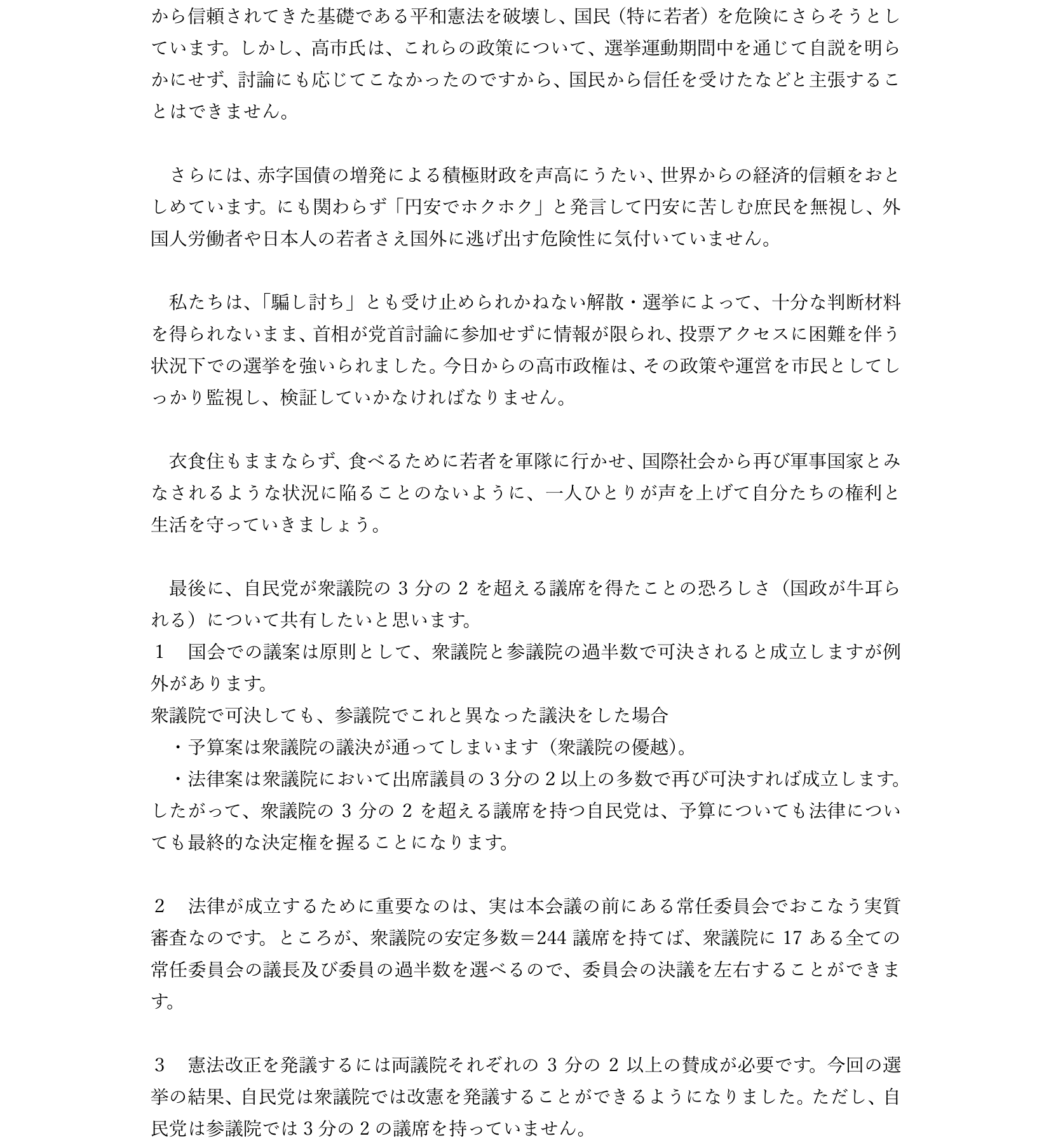 ・憲法で保障されている人権が尊重され、貧困や生きづらさから脱することができる東京に変えましょう。雇用、住まい、教育が享受できる東京に変えましょう。そのために、新しい都知事を選びましょう。