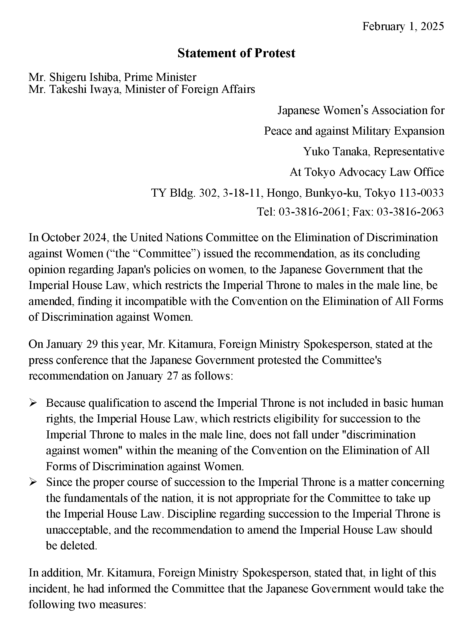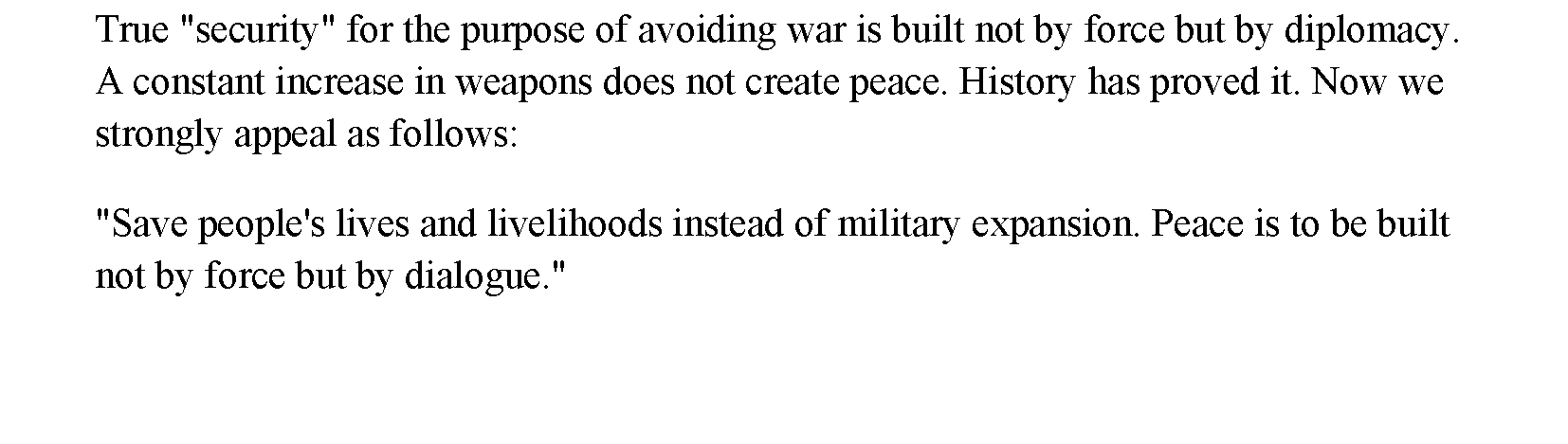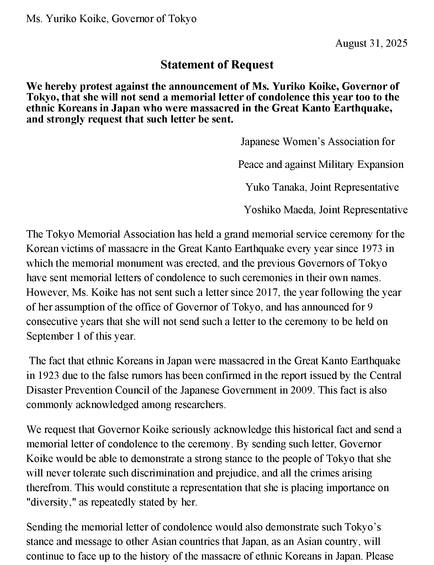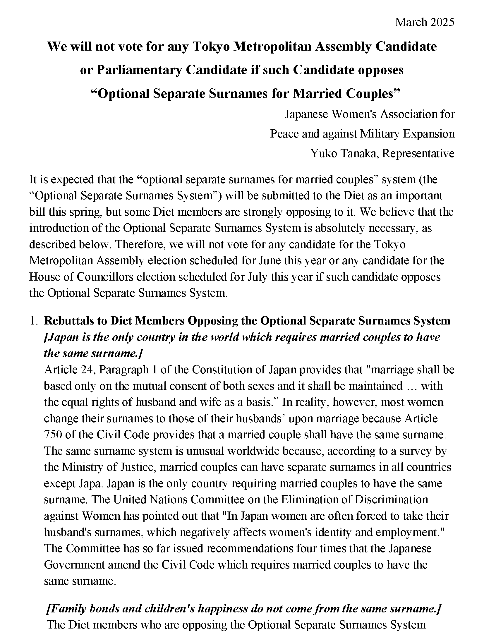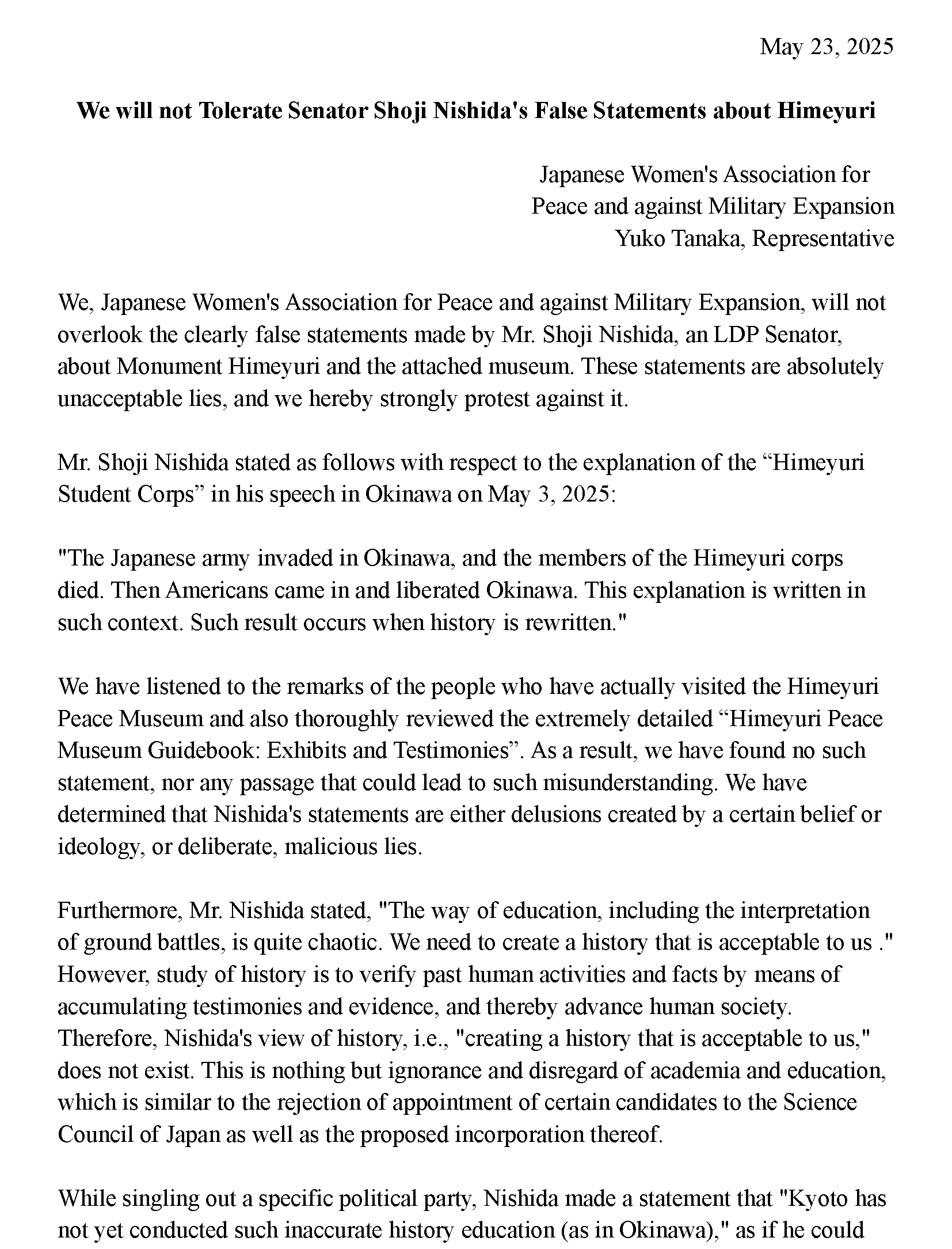 The "Japanese Women's Association for Peace and against Military Expansion " was launched by several women on January 11, 2023, and began an online signature campaign. On February 8, 2023, they held a press conference based on the collected signatures. At present, there is such association in each of the seven locations in Japan, including Tokyo, Kansai, Kumamoto, Hokkaido, Ibaraki, Miyazaki and Oita. These associations (collectively, “our Association”) are engaged in activities in cooperation with each other. We are the "Women's Association" for several reasons, as described below.