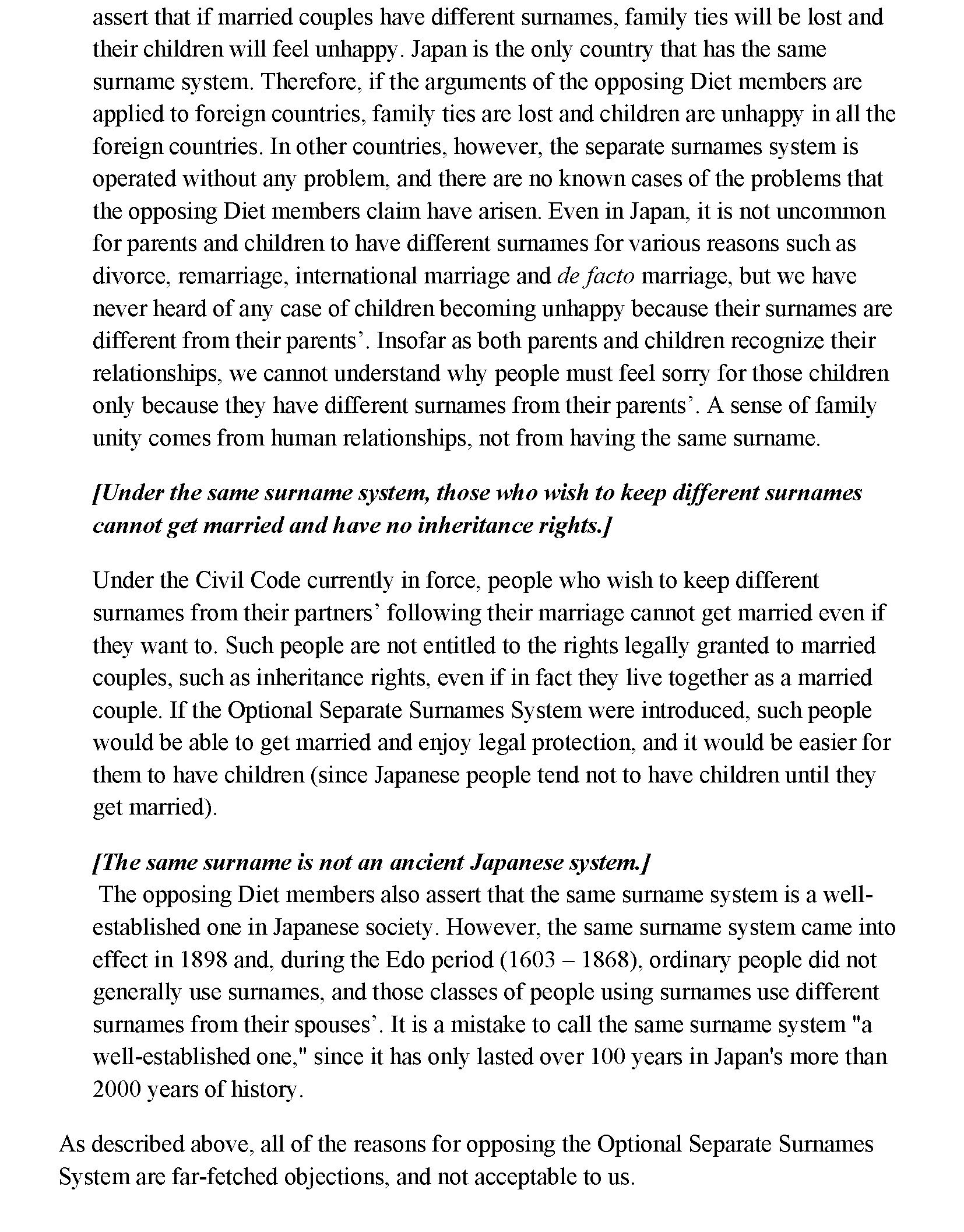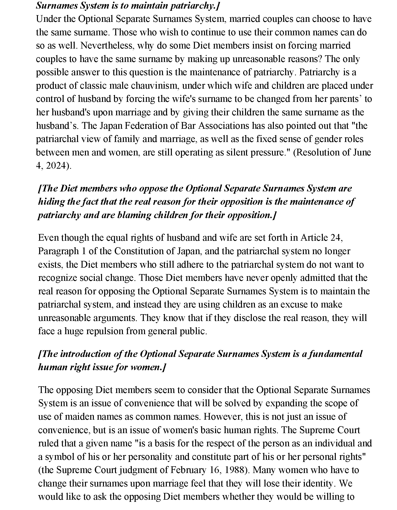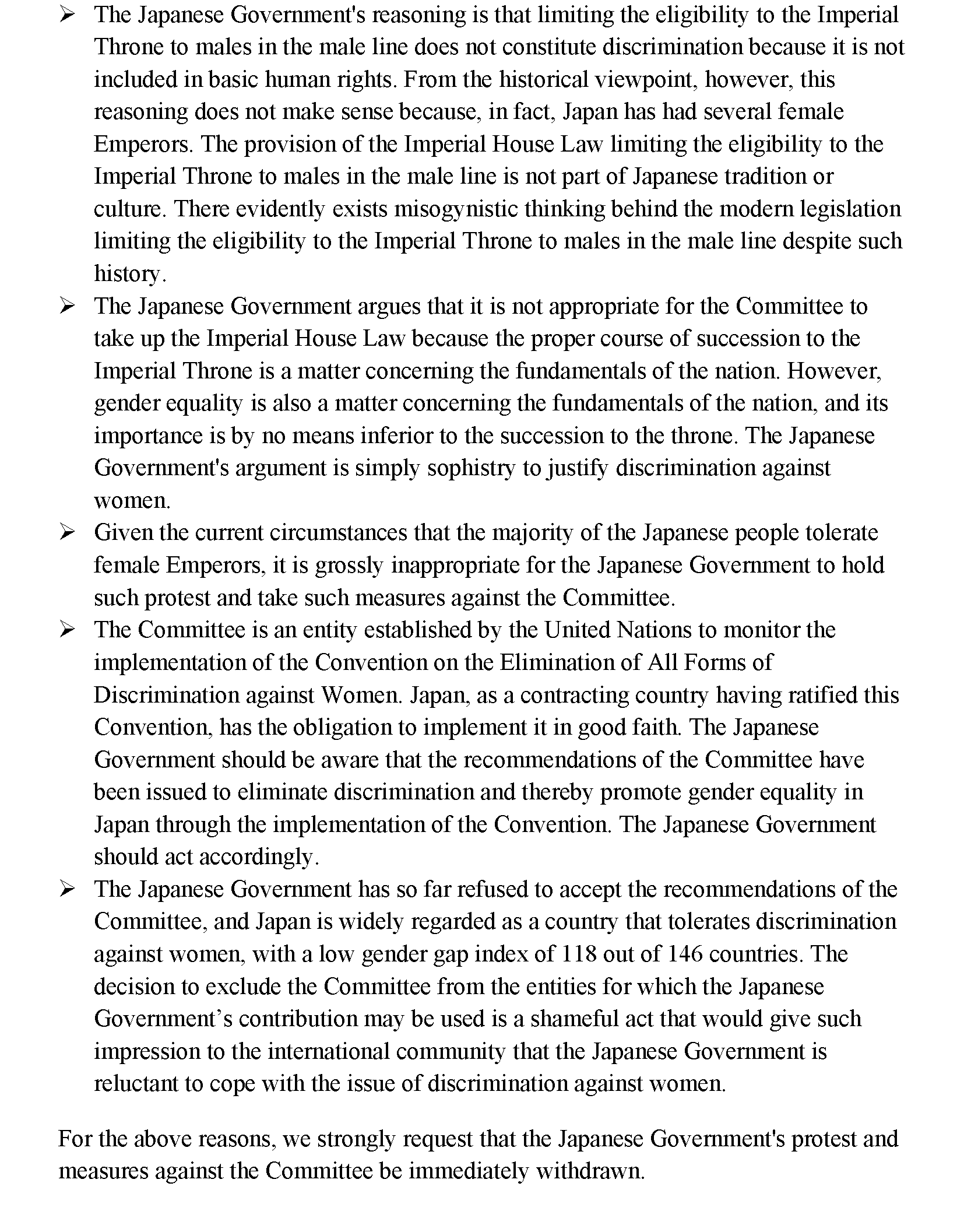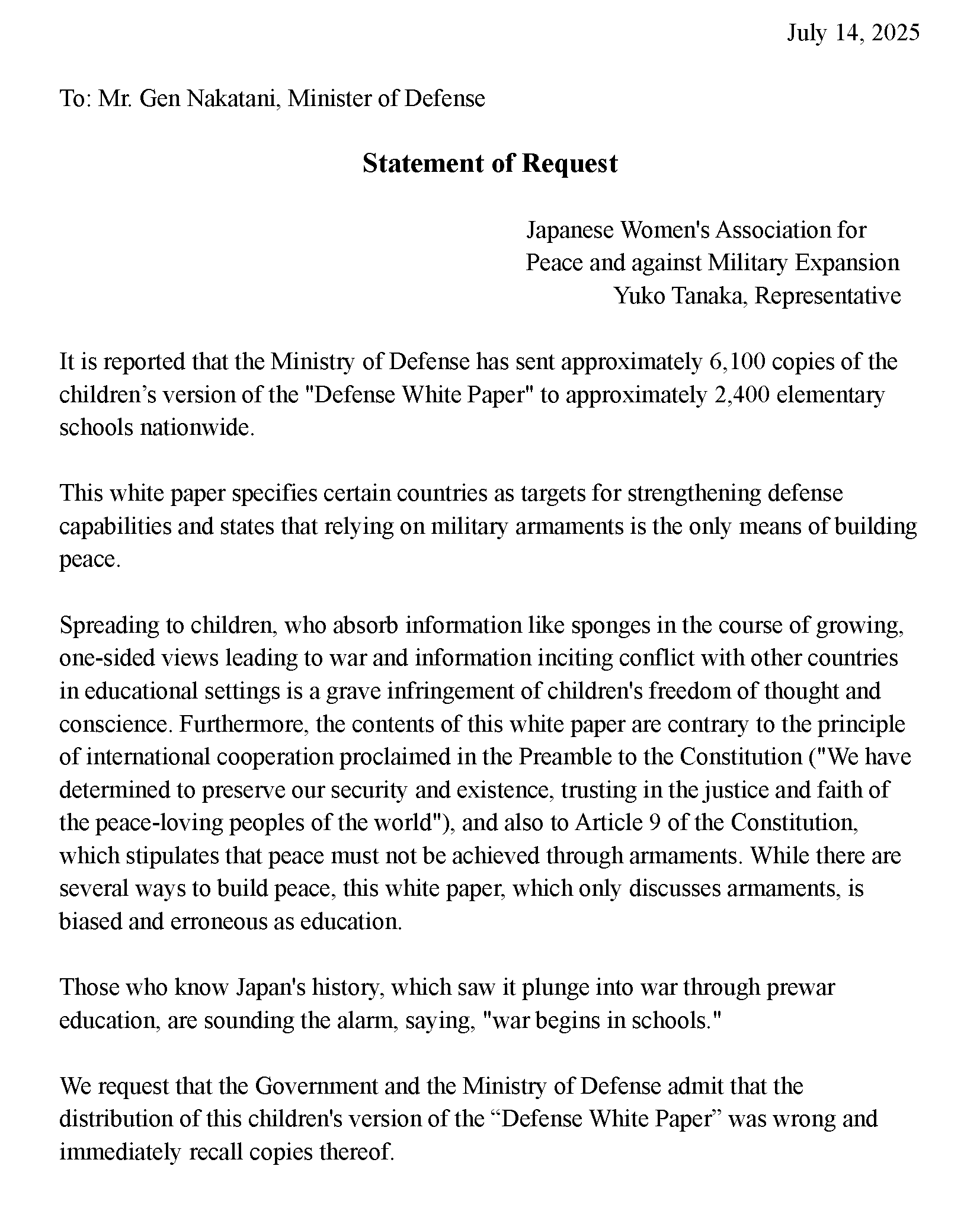 Women can now speak out. The members of our Association feel a serious sense of crisis about such situation that military expansion will have a negative impact on the countermeasures for the declining birthrate and the raising of workers' wages, as well as public support policies for the socially vulnerable, such as women, single-parent families, non-regular workers and children, and that public spending on education in Japan is the lowest among the developed countries.